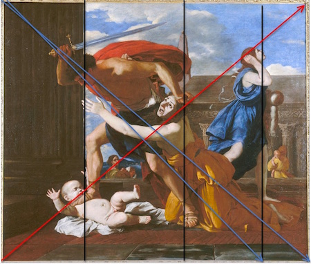 Le premier plan s’inscrit dans un carré limité à droite par la femme en deuil qui s’en va. Cela met en valeur une diagonale descendante qui part du haut gauche (tête et main du bourreau) et se dirige vers le bas à droite (jambe de la femme agenouillée). La même technique concerne têtes et bras des deux personnages disposés autour de la diagonale du tableau en son entier.