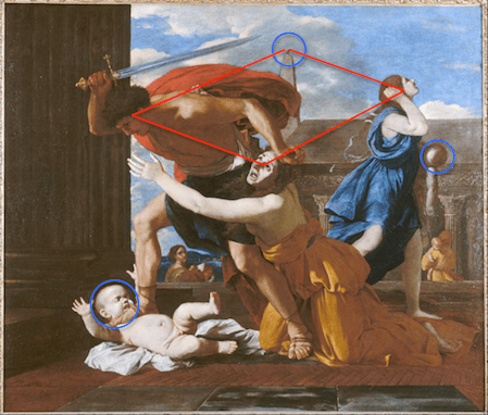 Le lien entre les trois personnages et « l’au-delà » pourrait bien être renforcé par le rapport entre leurs têtes : elles constituent, avec le sommet de l’obélisque du pignon du temple (une boule), les angles d’un parallélogramme. À noter : la « boule » que fait la tête de l’enfant mort ; dans une esquisse préparatoire au tableau (voir ci-dessous) la boule qui termine l’obélisque était beaucoup plus importante.